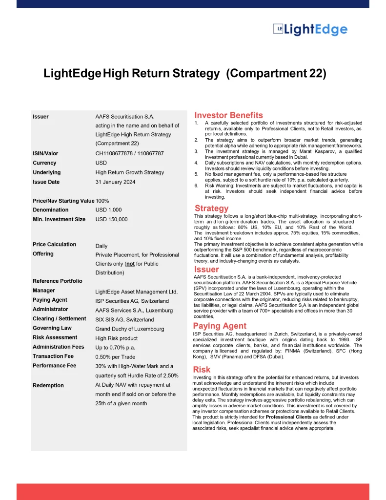 — AMC structure under Luxembourg law— Admin fee: 0.7% p.a.— Performance fee: 30% with High Water Mark— Daily liquidity (NAV ± 0.5%)